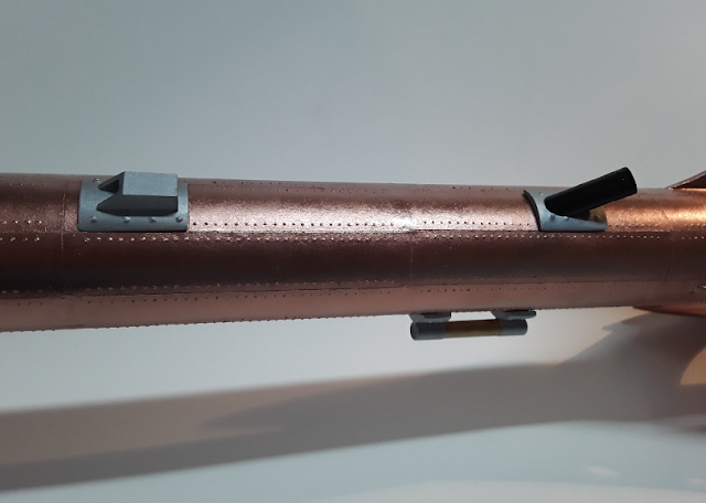 The first of these are made to adorn the main body tube with 'metal' strips placed at each of the joints formed by the riveted 'copper' skin panels.